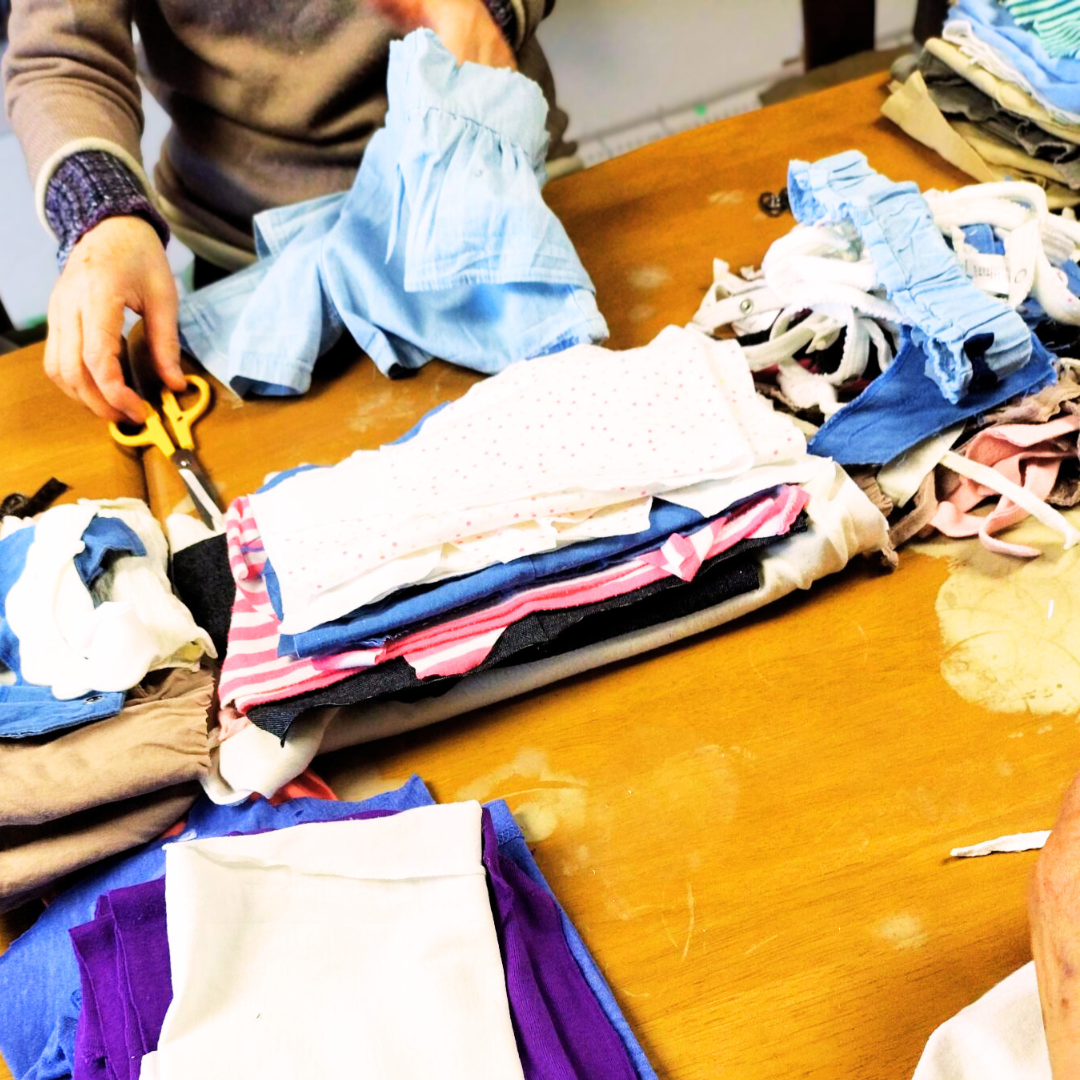 1月13日、21名の部員が集まり、3部屋に分かれて作業しました。残っている子ども服は工夫が必要なものが多く、「これでOK?」「こうしたらもっときれいに仕上がるよ」と声を掛け合いながら、裁断を進めました。