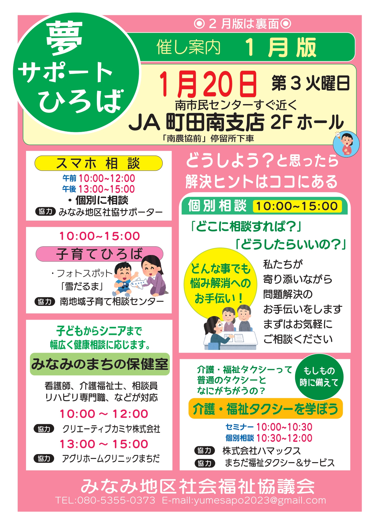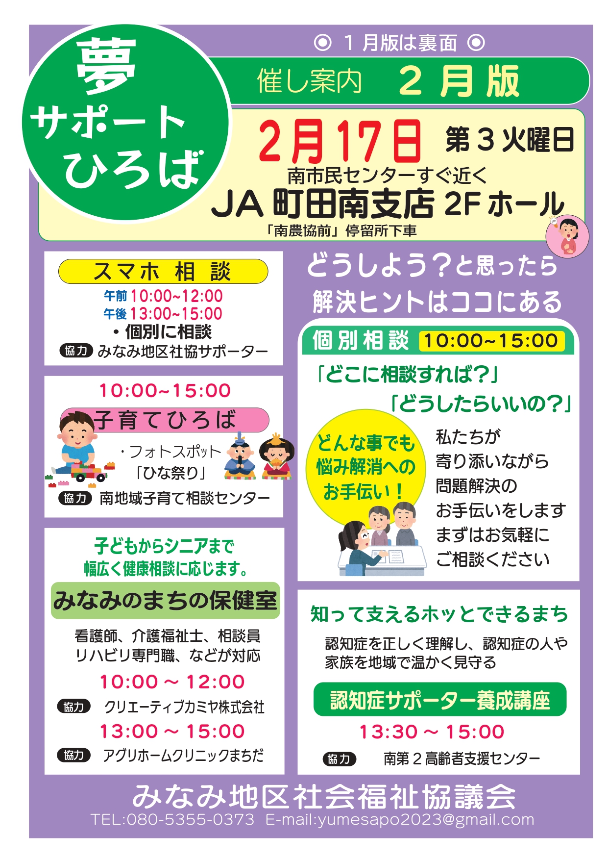 みなみ地区社会福祉協議会では「地域福祉をもっと身近なものに」をキーワードに、地域住民が気軽になんでも相談できる地域の窓口として「夢サポートひろば」を開催します。