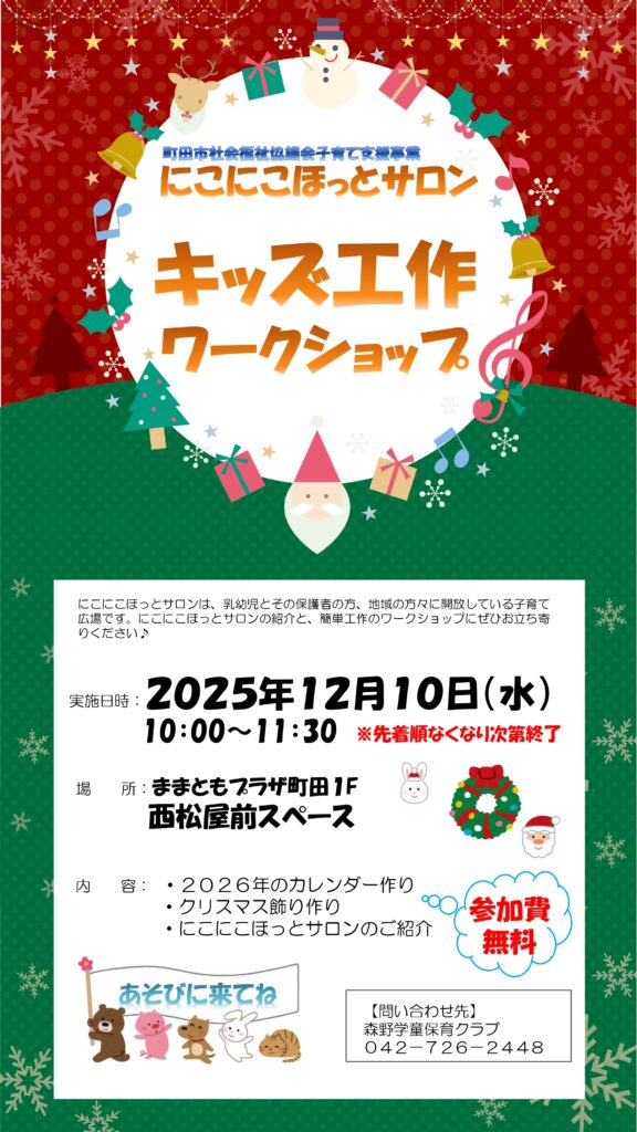今回、いつもの学童保育クラブから飛び出して、下記の場所で「にこにこほっとサロンキッズ工作ワークショップ」を開催します。カレンダーやクリスマス飾りなど季節の楽しいワークショップになります!参加費も無料ですのでぜひお気軽にお立ち寄りください!