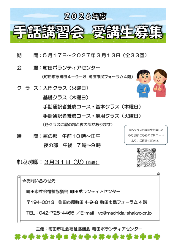 | 問合せ先 | 町田市社会福祉協議会 町田ボランティアセンター 〒194-0013 町田市原町田4-9-8 町田市民フォーラム4階 TEL:042-725-4465 |